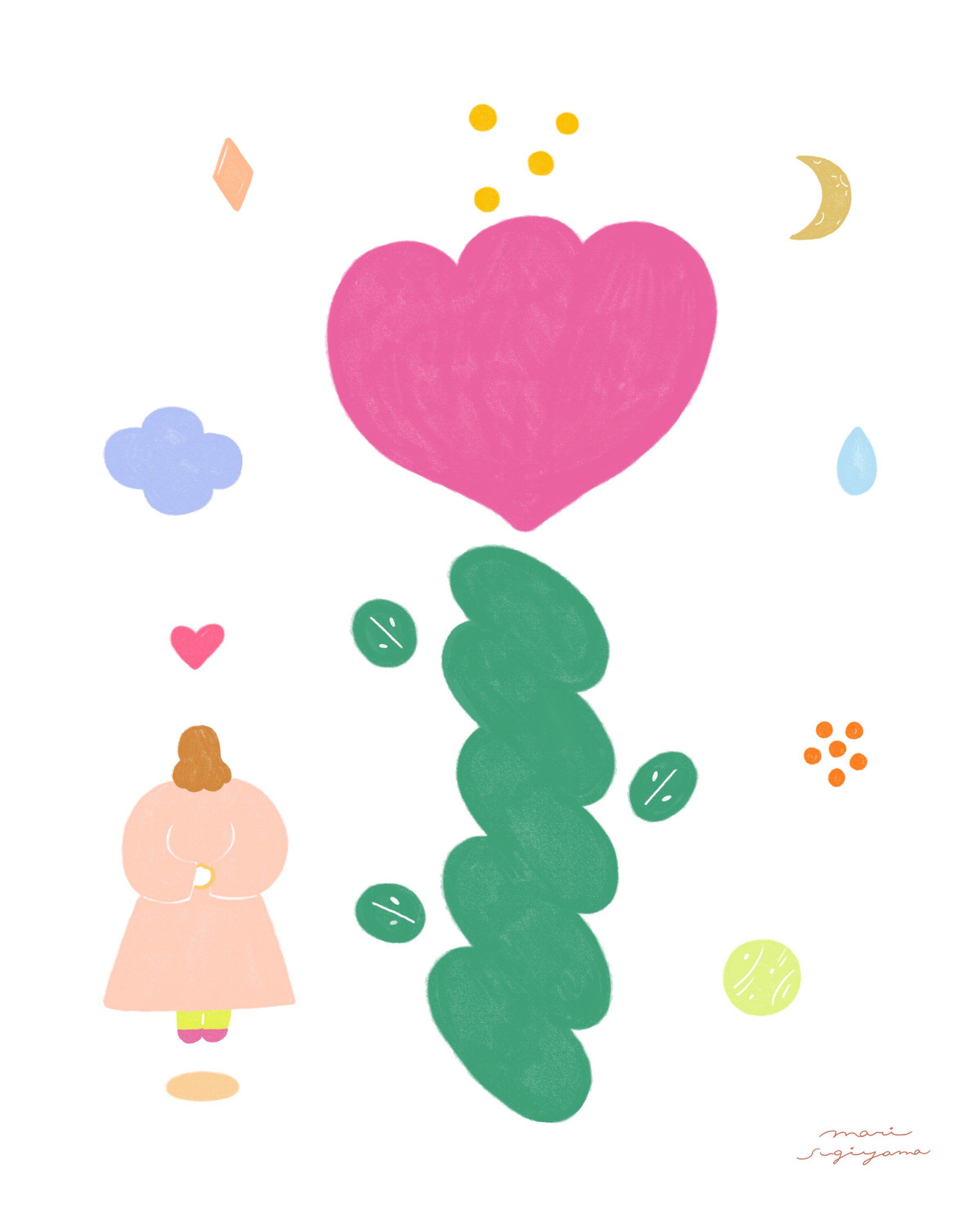 ポップで明るい色合いの、お花と人物を描いたイラストです。